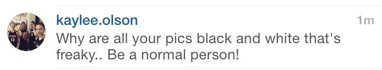 Tradução: Porque todas as suas fotos são em preto e branco o que é esquisito.. Seja uma pessoal normal! |